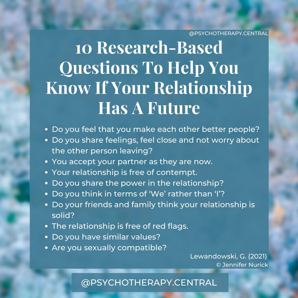 Lewandowski’s recent article in Psychology Today has a complete list of 15 research-based questions that look at different angles of your relationship. They are a great place to start if you are wondering about your relationship long term.