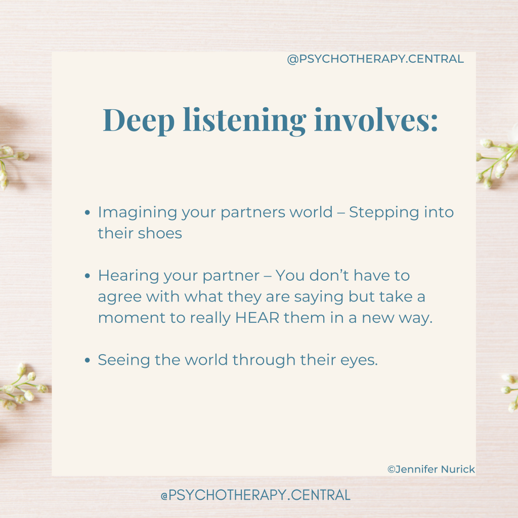 The power of the deep listening that happens in therapy is validation. Often our partners find it difficult to be with us in our pain because of their wounds. They might be afraid to really go into the hurt with us because they may fear that they will never come out. Or they may feel like if they feel our pain, they will never be able to disagree with us on this topic again.