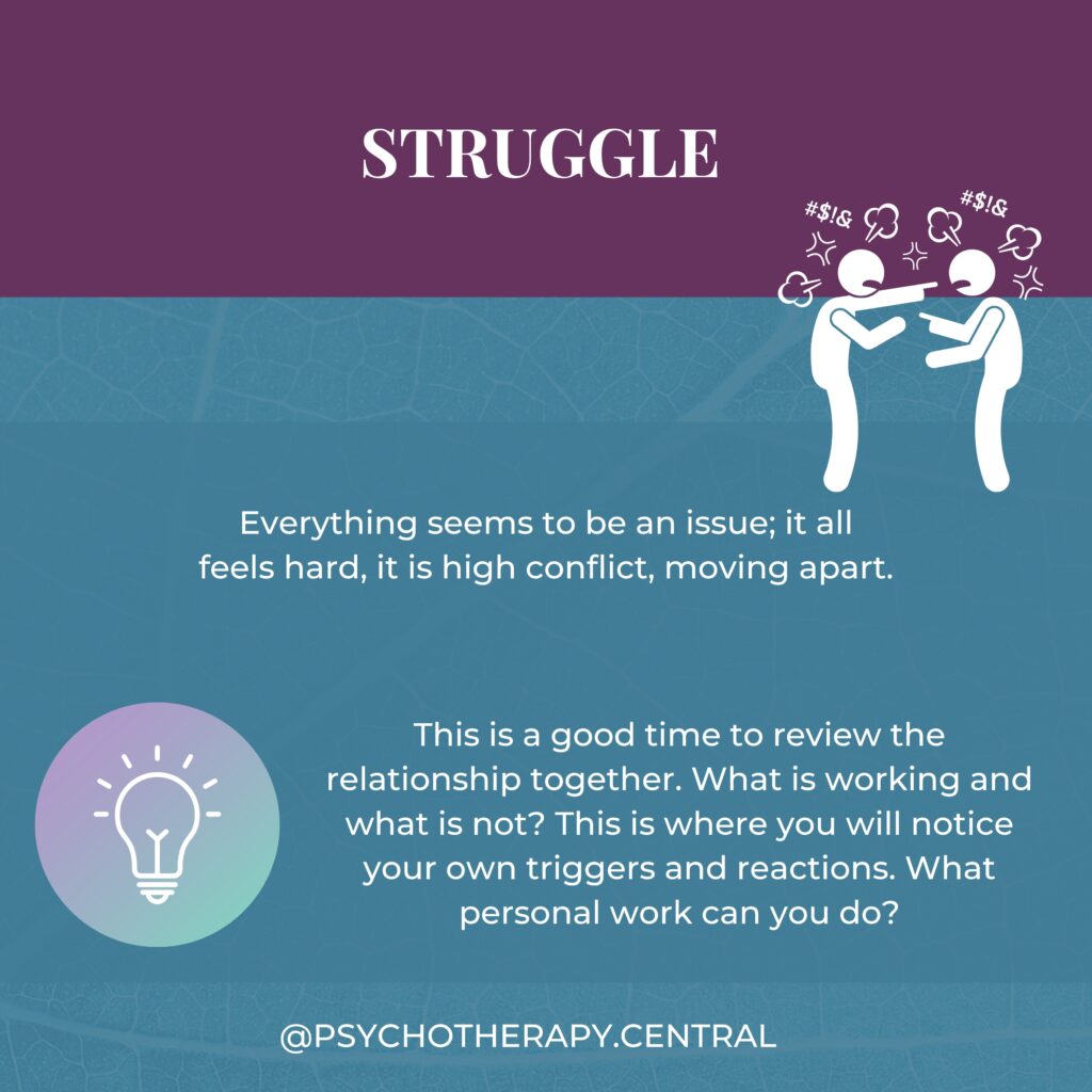 Over and over again, I see the ‘struggle’ phase as the deciding moment in a relationship. Is there enough keeping you in the relationship to move into the next phase of ‘repair’? How well is the repair done? For example, during the struggle, there may have been a period of deliberately hurting one another or making each other feel jealous. During the repair phase, what boundaries do you establish? Do you talk through what happened for each of you honestly? Do you both own your parts in what happened? Or is it all swept under the carpet?
