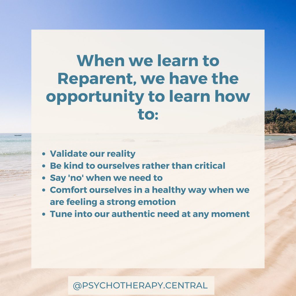 It is possible to learn to reparent yourself, to learn how to be present with the scared and lonely inner child who feels rejected and hurt. As we reparent we learn to sit with them in painful moments, to acknowledge and validate the pain. We learn how to speak to ourselves in the form of the inner child, with the greatest love and compassion.