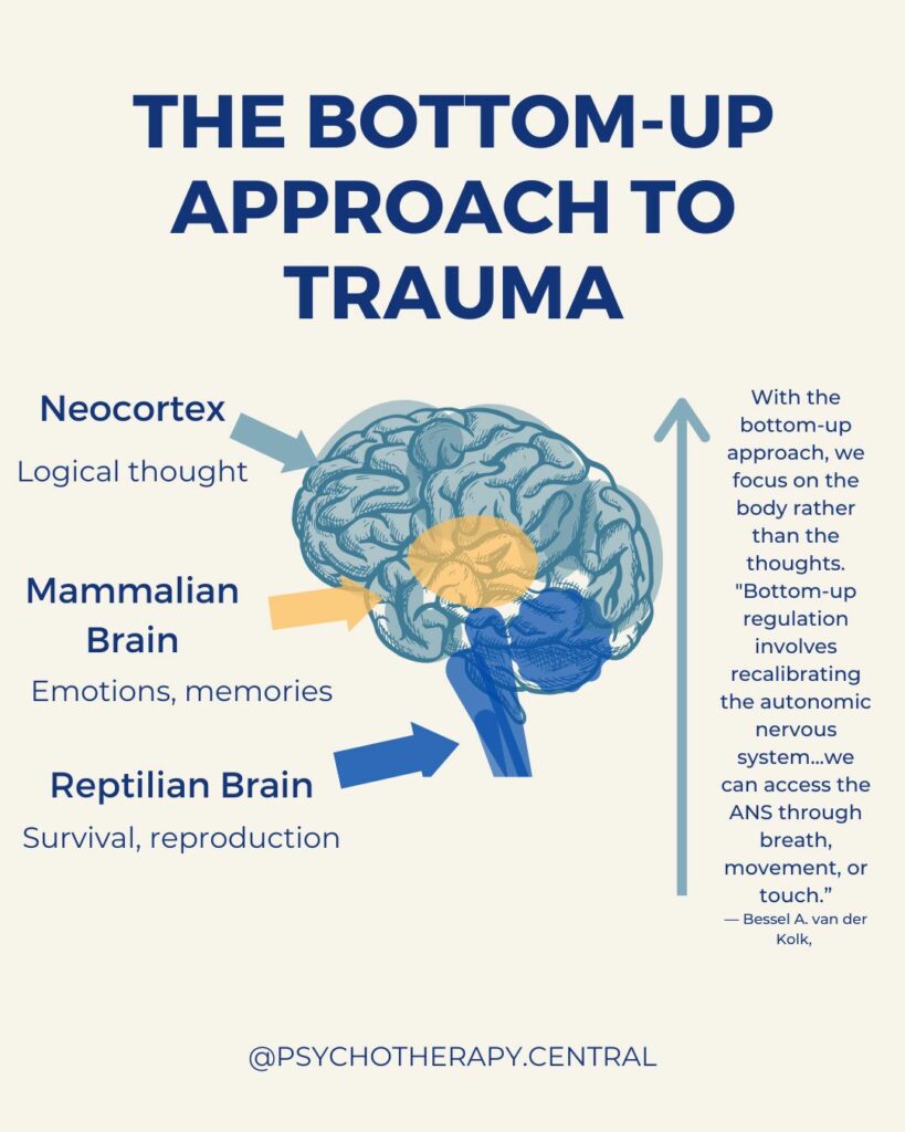 We start with the body—the brainstem and limbic system. This approach helps us gently process the trauma that’s stored in our nervous system.
