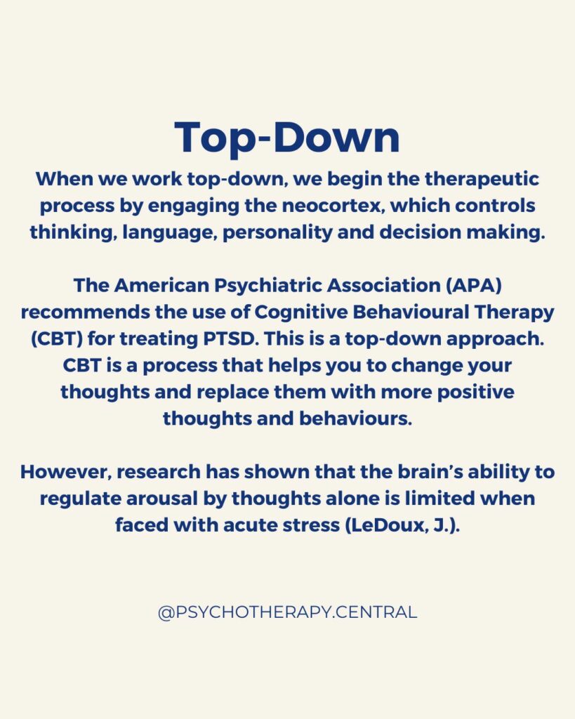 A top-down approach starts with the thinking brain (neocortex). Cognitive Behavioural Therapy (CBT) is a good example—reframing thoughts to shift behaviour.