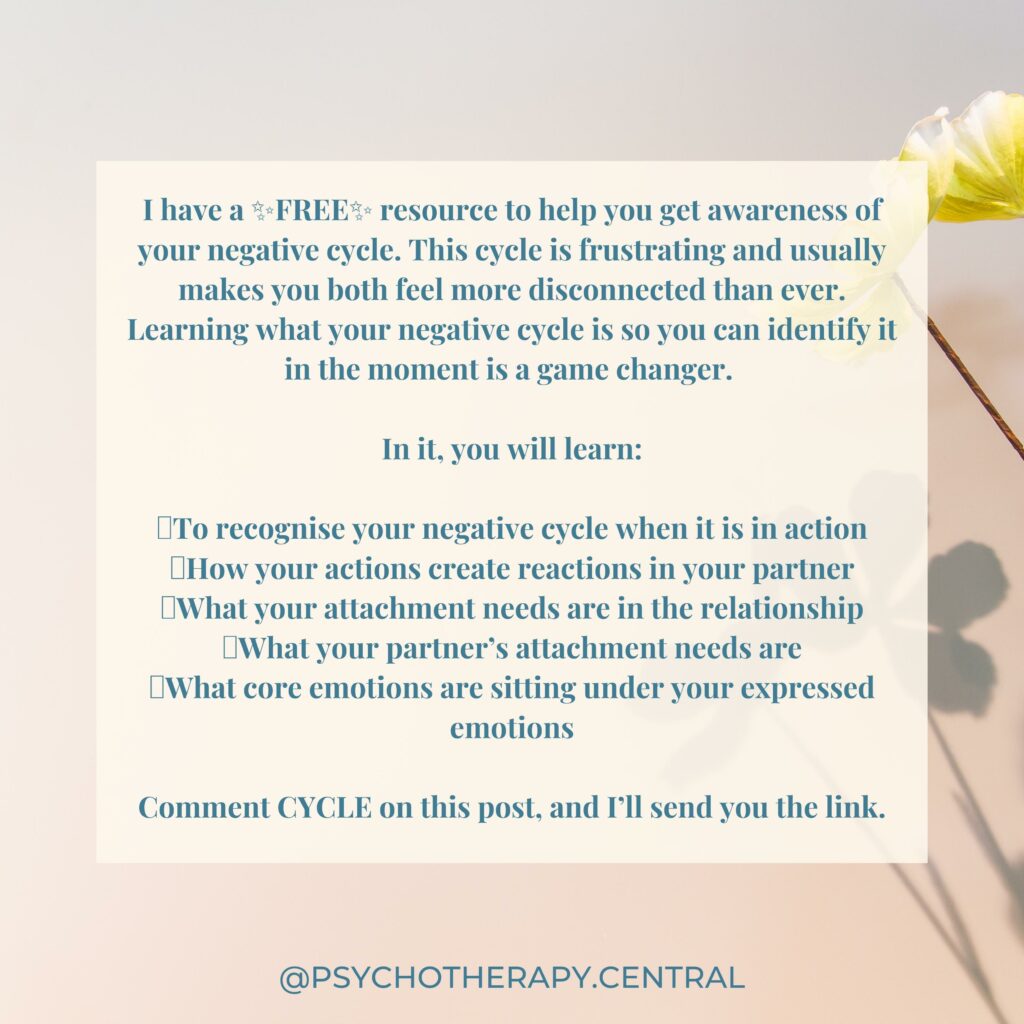 I have a FREE resource to help you get awareness of your negative cycle. This cycle is frustrating and usually makes you both feel more disconnected than ever. Learning what your negative cycle is so you can identify it in the moment is a game change