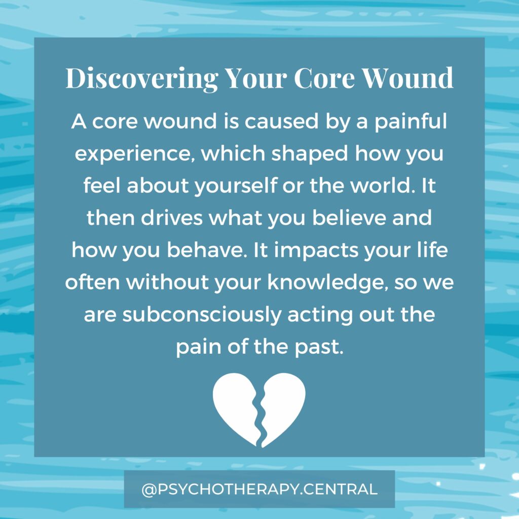 A core wound is caused by a painful experience, which shaped how you feel about yourself or the world. It then drives what you believe and how you behave. It impacts your life often without your knowledge, so we are subconsciously acting out the pain of the past.