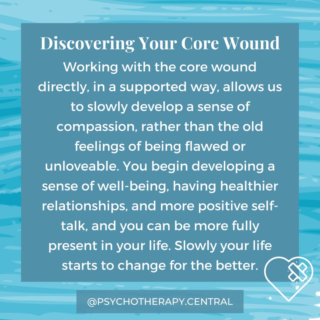 Working with the core wound directly, in a supported way, allows us to slowly develop a sense of compassion, rather than the old feelings of being flawed or unloveable. You begin developing a sense of well-being, having healthier relationships, and more positive self-talk, and you can be more fully present in your life. Slowly your life starts to change for the better.