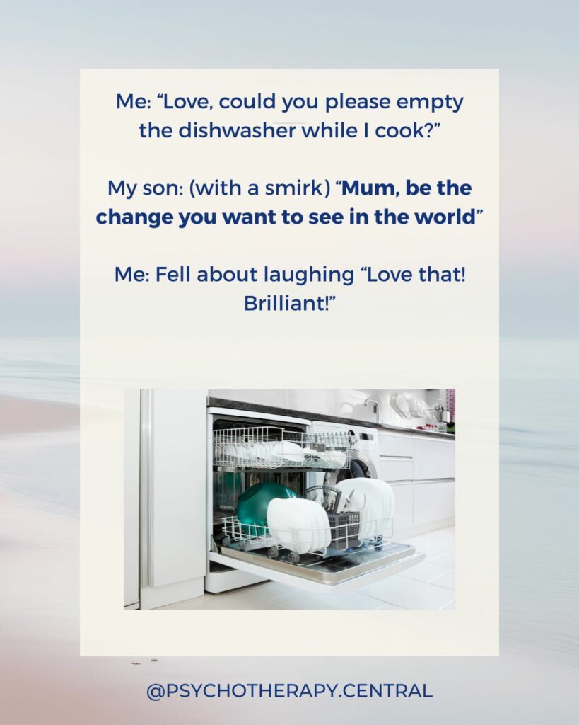 Be the change you want to see Me: “Love, could you please empty the dishwasher while I cook?” My son: (with a smirk) “Mum, be the change you want to see in the world” Me: Fell about laughing “Love that! Brilliant!”