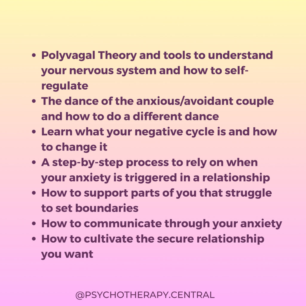 - How negative cycles show up in relationships between the anxious and avoidant attachment styles, and how to break these cycles and create more intimacy. Complete with scripts, suggestions and practical things to try out.