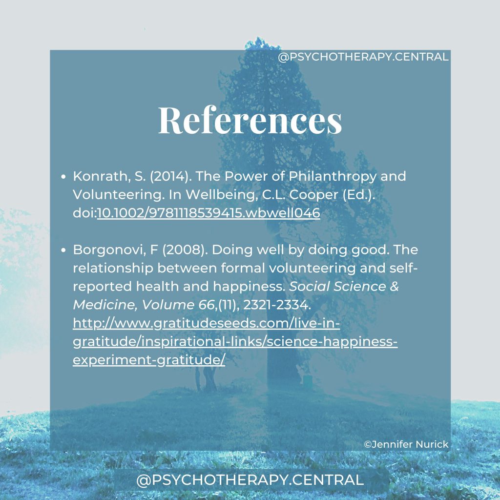 Borgonovi, F (2008). Doing well by doing good. The relationship between formal volunteering and self-reported health and happiness. Social Science & Medicine,