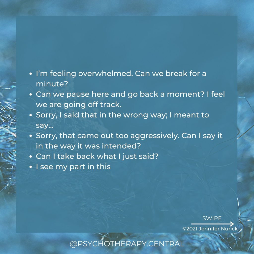 When we are in conflict it is only natural that we will make mistakes, say things we regret, or with the wrong tone of voice. We can learn to correct these mistakes in the moment and get the discussion back on track. It might take a bit of vulnerability to say, “I said that in the wrong tone, can I repeat it how I meant it to sound?” or “I’m feeling overwhelmed, and I need your help right now”.⁣⁣