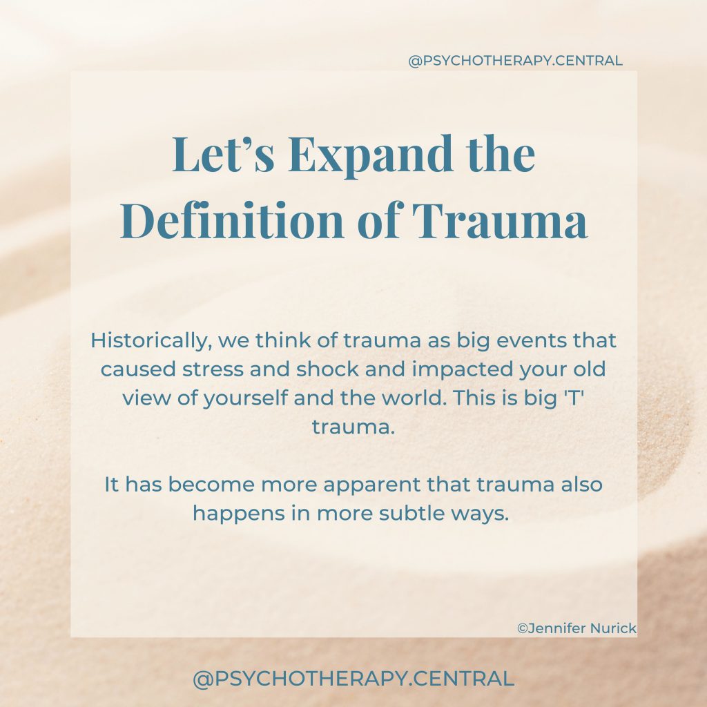 Let’s expand the definition of trauma. Historically, we think of trauma as big events that caused stress and shock and impacted your old view of yourself and the world. This is big ‘T’ trauma. It has become more apparent that trauma also happens in more subtle ways.