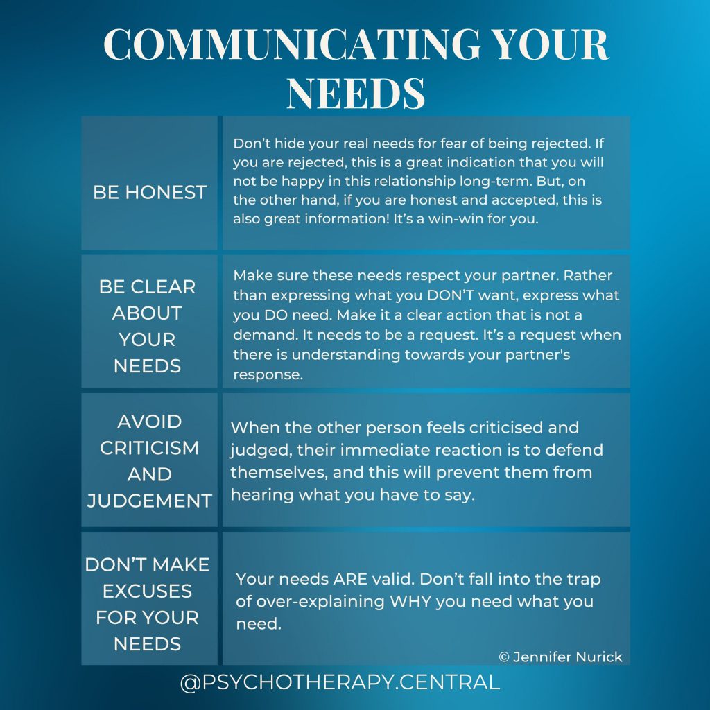 Remember that you are the only expert on you. Nobody else can read your mind and know what you need. It is up to you to first identify your needs for security, safety, love, time alone and then let your partner know.