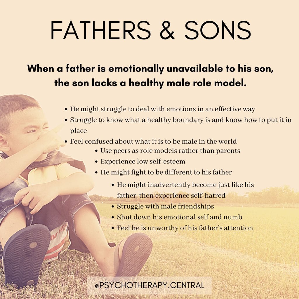 As an adult the son might find it difficult to express emotions, having learned to be emotionally numb from his father. He might also grow up to be an absent father, either physically or emotionally, as this is the pattern he has learnt from his father. He has learnt that father’s don’t really need to be present or interested in their children.