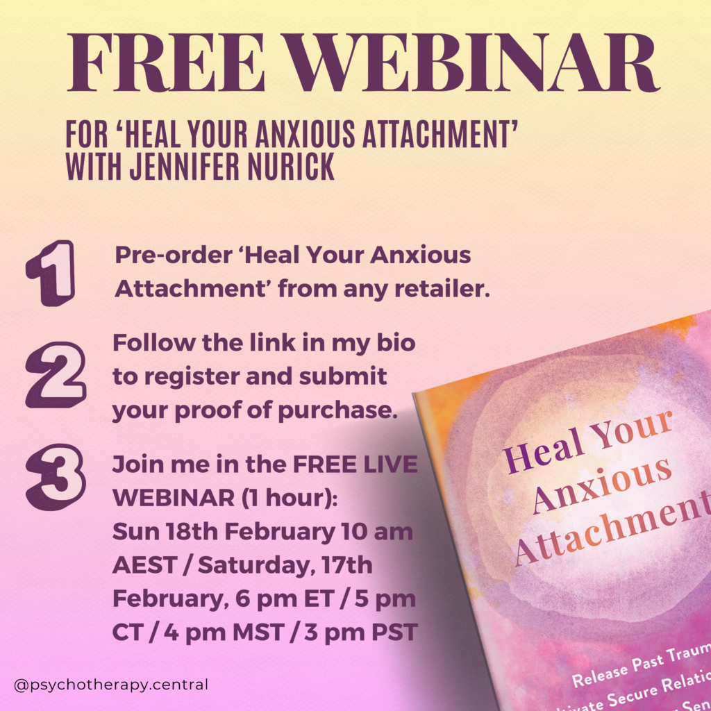 Welcome to this special free webinar on healing anxious attachment. This is an exclusive opportunity to get all your questions answered and learn about Anxious Attachment from the Founder of Psychotherapy Central and author of “Heal Your Anxious Attachment”, Jennifer Nurick. To save your spot, click here and follow the instructions.