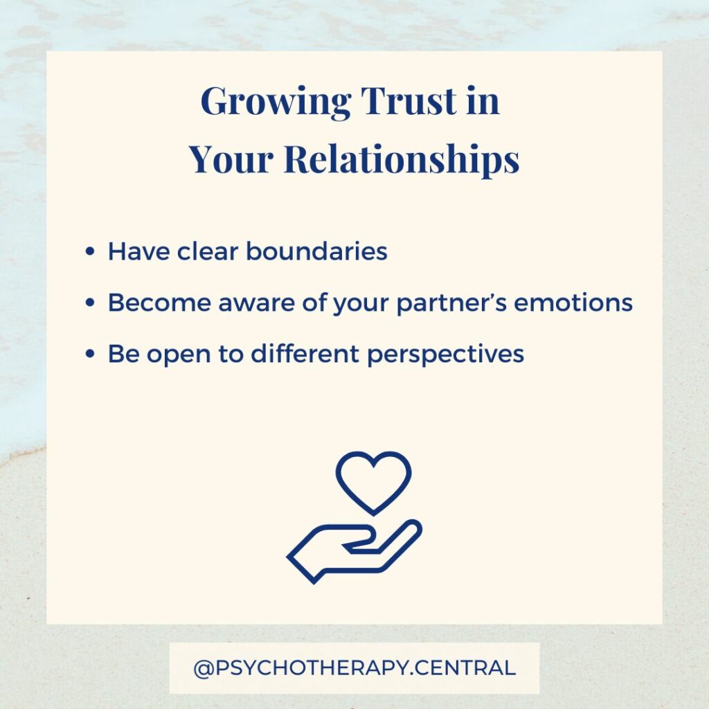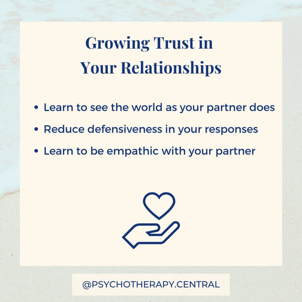 Learning to be empathetic with your partner is one of the most powerful things you can do to build trust in your relationship. Empathy is the ability to stand in another person’s shoes and see the world from their perspective. Empathy helps with defensiveness. If we tend to be defensive in conflict, seeing the world through our partner’s eyes will often allow us to take more responsibility than if we don’t do this.
