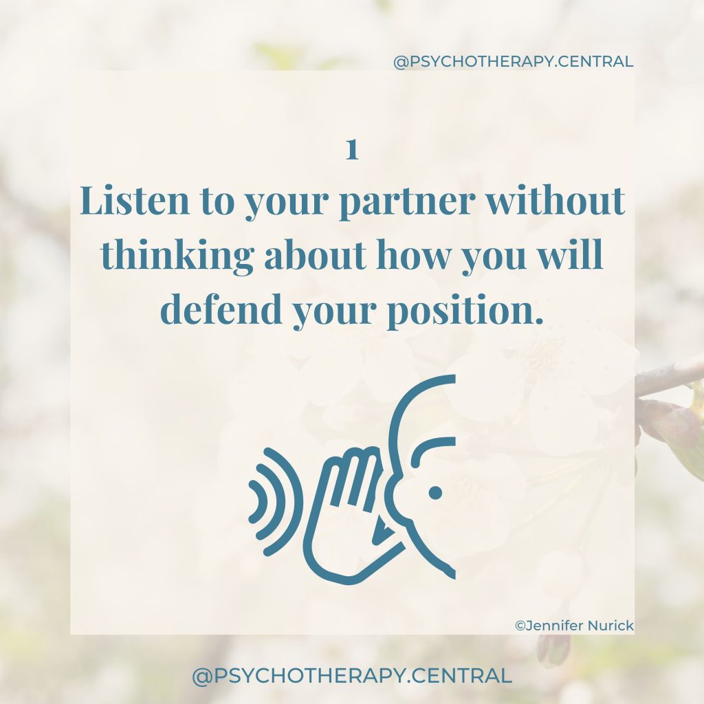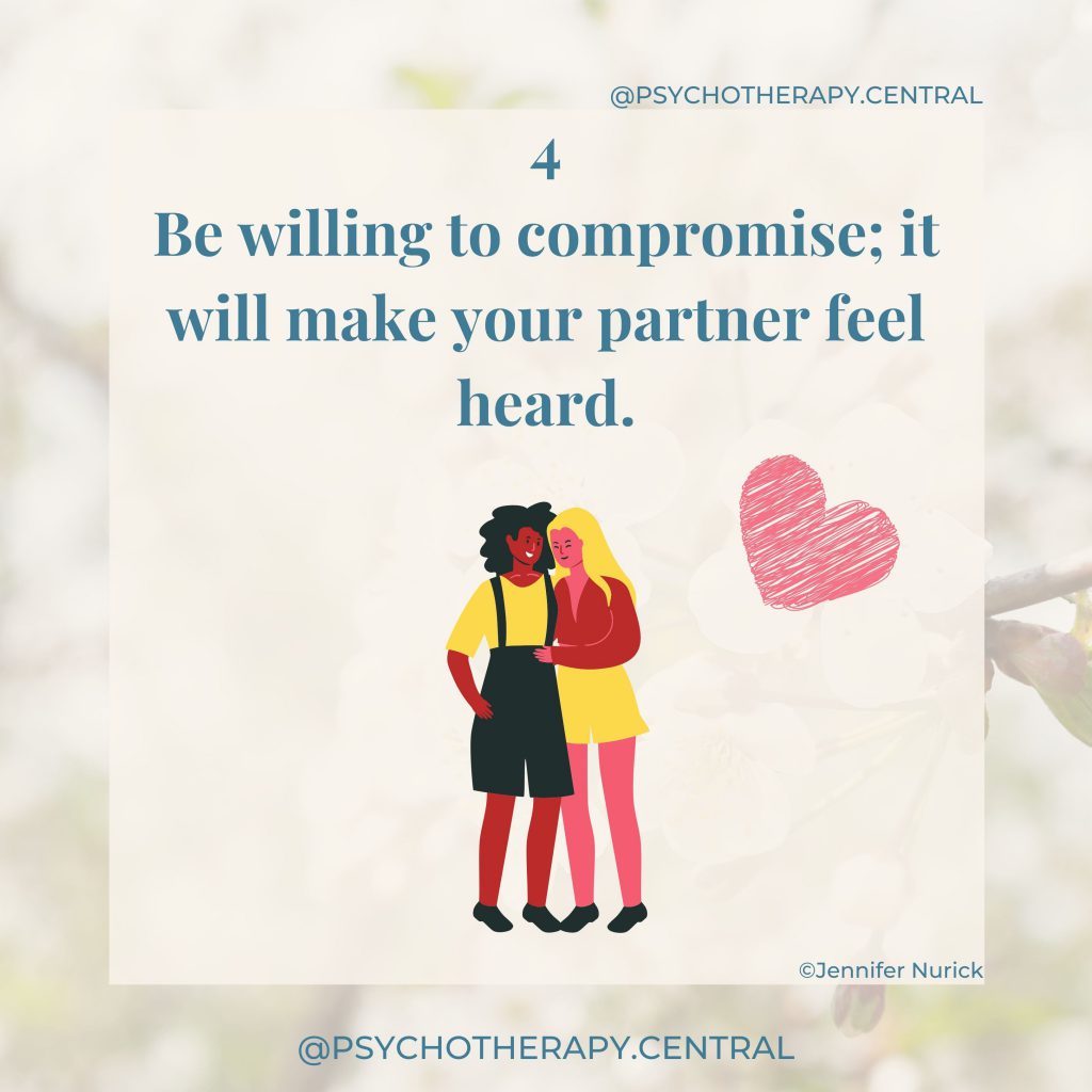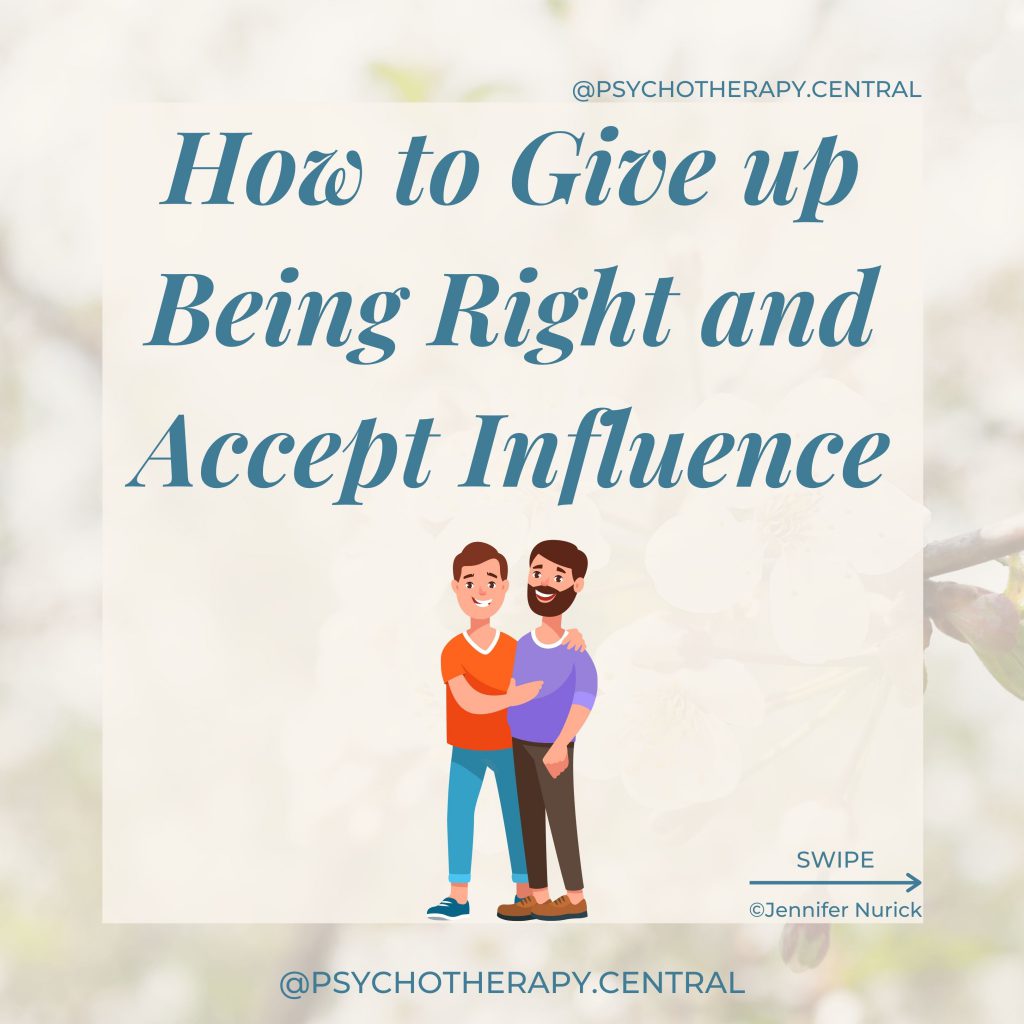 As adults, we need to learn how to accept our partner’s influence and collaborate and negotiate in relationships. Accepting influence is one way to respect your partners’ point of view, to take a moment to stand in their shoes and see the world as they see it.