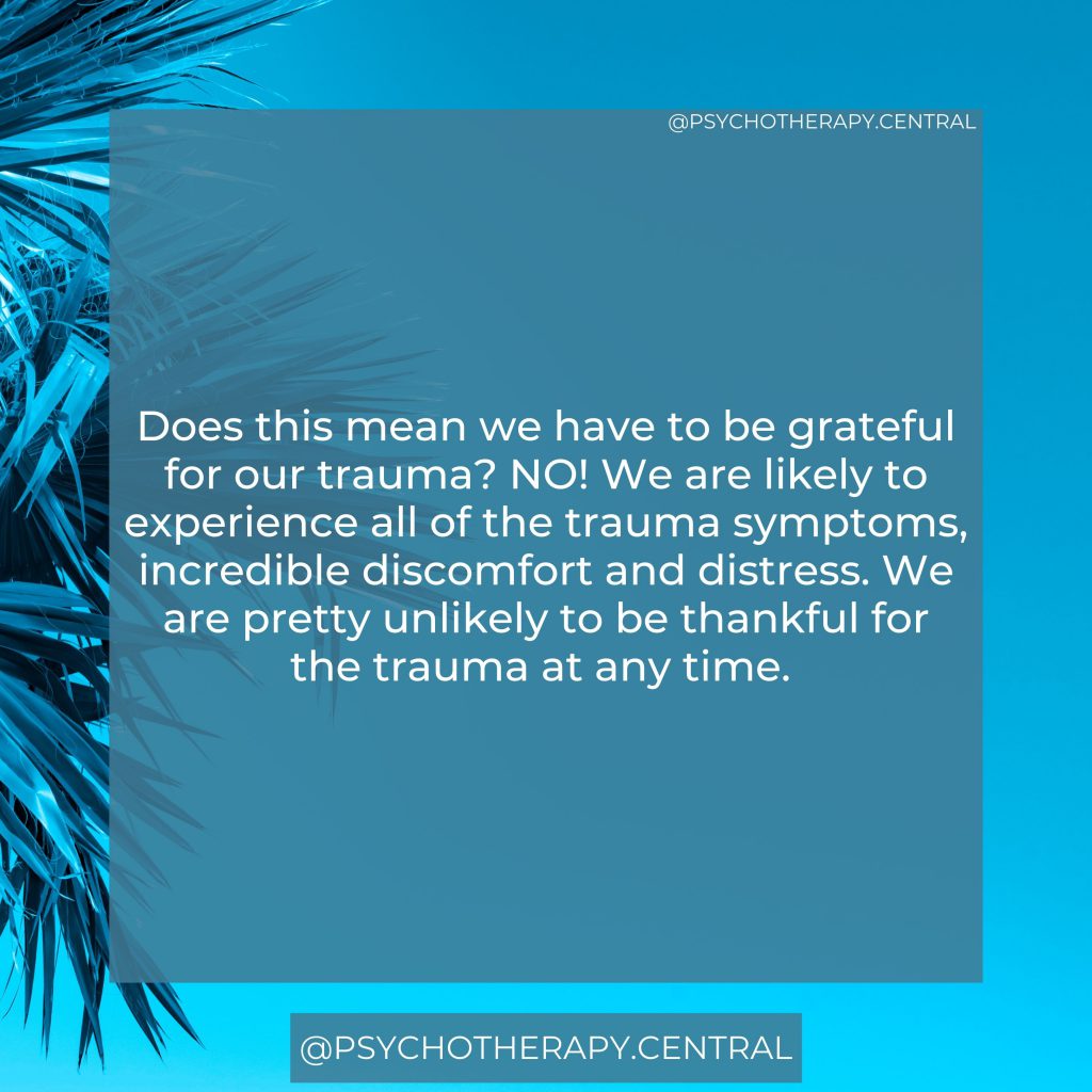 Does this mean we have to be grateful for our trauma? NO! We are likely to experience all of the trauma symptoms, incredible discomfort, and distress. We are pretty unlikely to be thankful for the trauma at any time.