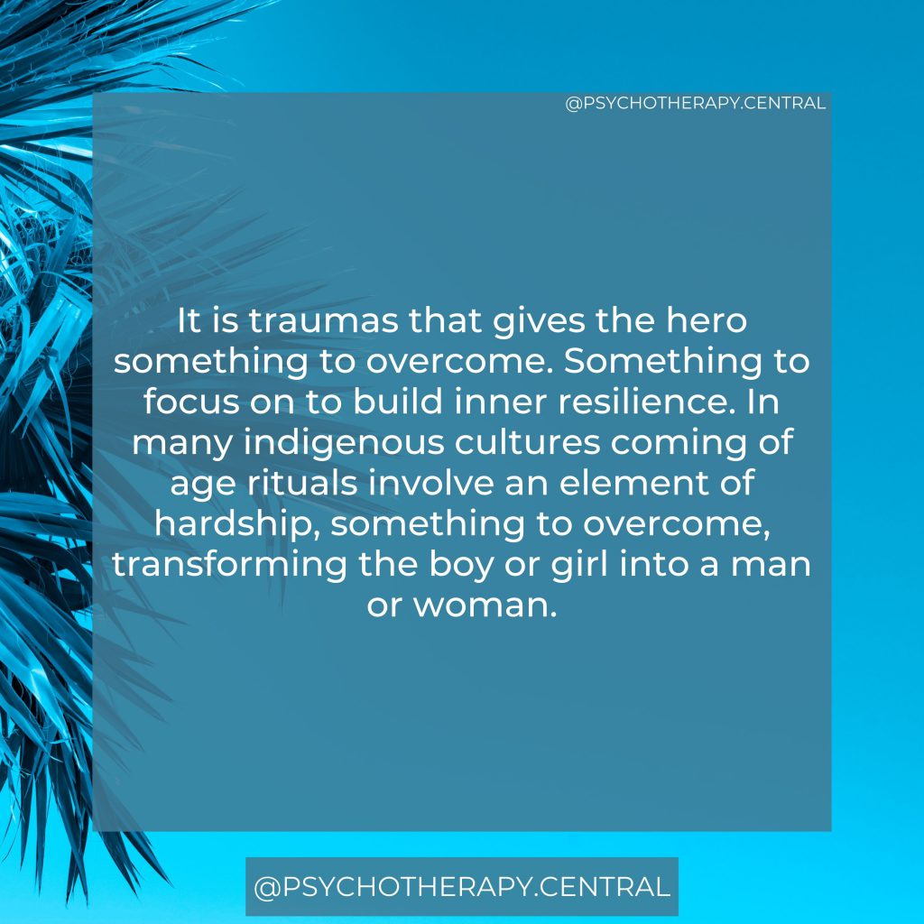 It is traumas that gives the hero something to overcome. Something to focus on to build inner resilience. In many indigenous cultures coming of age, rituals involve an element of hardship, something to overcome, transforming the boy or girl into a man or woman.