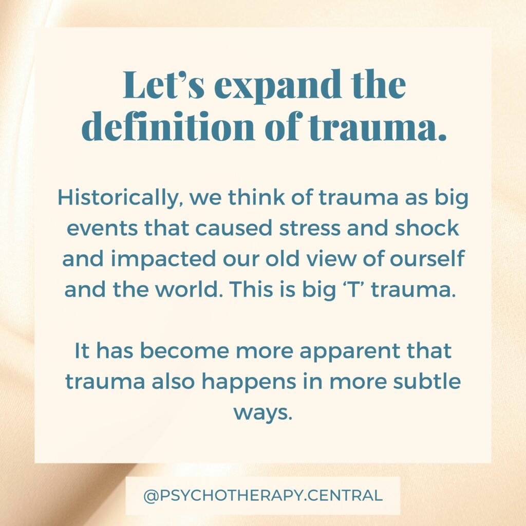Let’s expand the definition of trauma. Historically, we think of trauma as big events that caused stress and shock and impacted your old view of yourself and the world. This is big ‘T’ trauma. It has become more apparent that trauma also happens in more subtle ways.