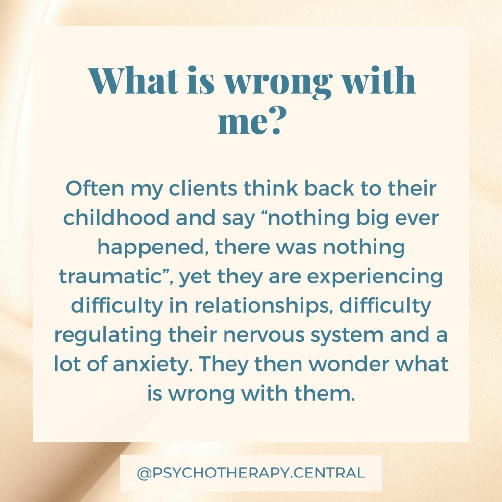 Often my clients think back to their childhood and say “nothing big ever happened, there was nothing traumatic”, yet they are experiencing difficulty in relationships, difficulty regulating their nervous system and a lot of anxiety. They then wonder what is wrong with them.