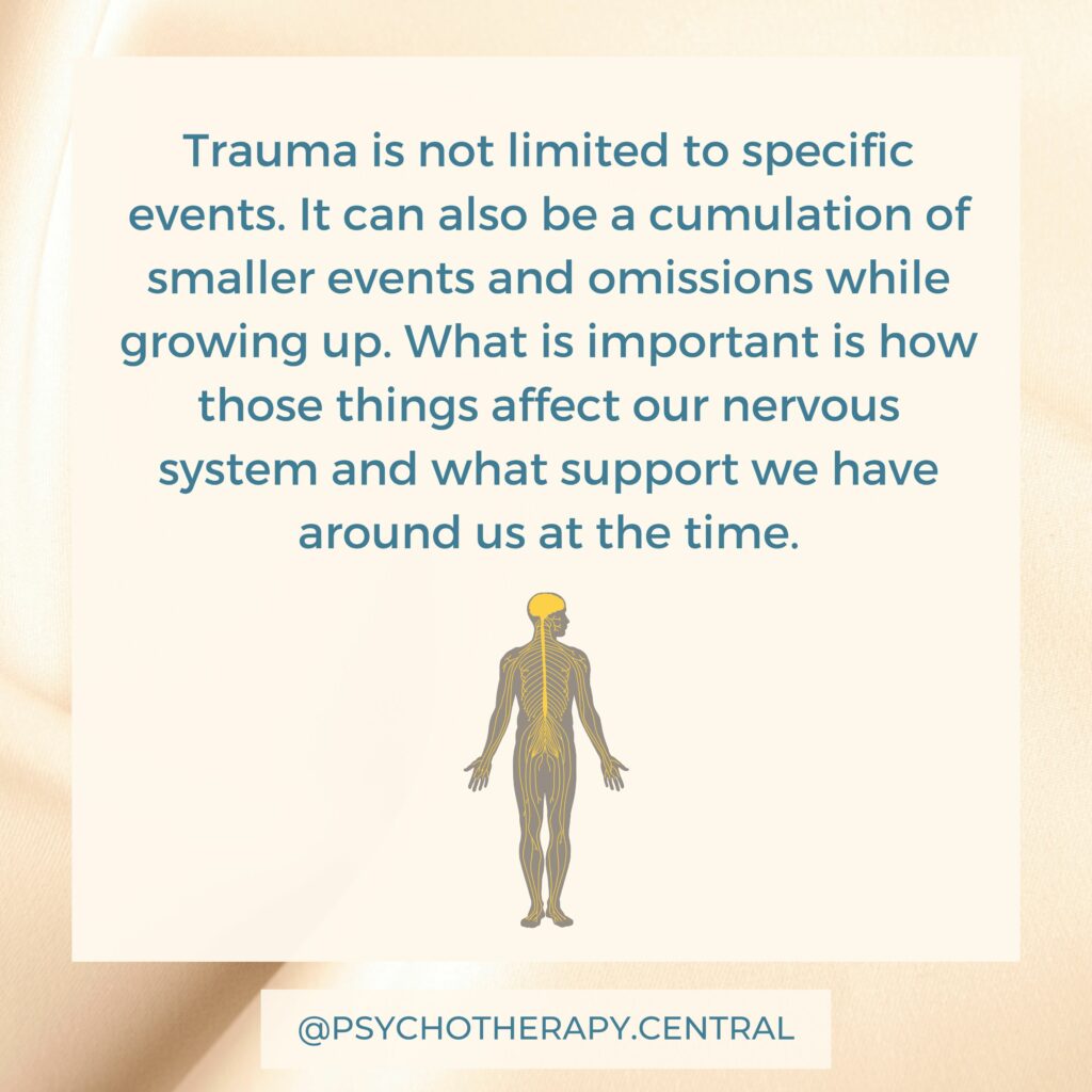 Trauma is not limited to specific events. It can also be a cumulation of smaller events and omissions while growing up. What is important is how those things affect our nervous system and what support we have around us at the time.