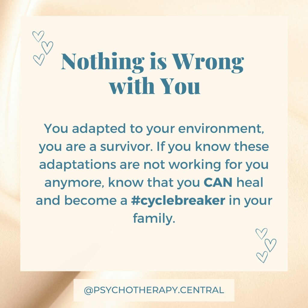 Nothing is wrong with you. You adapted to your environment, you are a survivor. If you know these adaptations are not working for you anymore, know that you CAN heal and become a cyclebreaker in your family.