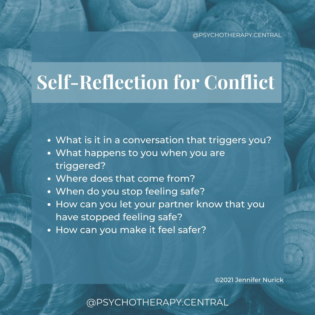 Both of you come into the relationship with individual experiences around conflict. One of you might have learned to stay until the end of a conflict, and the other learned that it is normal for one of you to storm off and be passive-aggressive for days after.