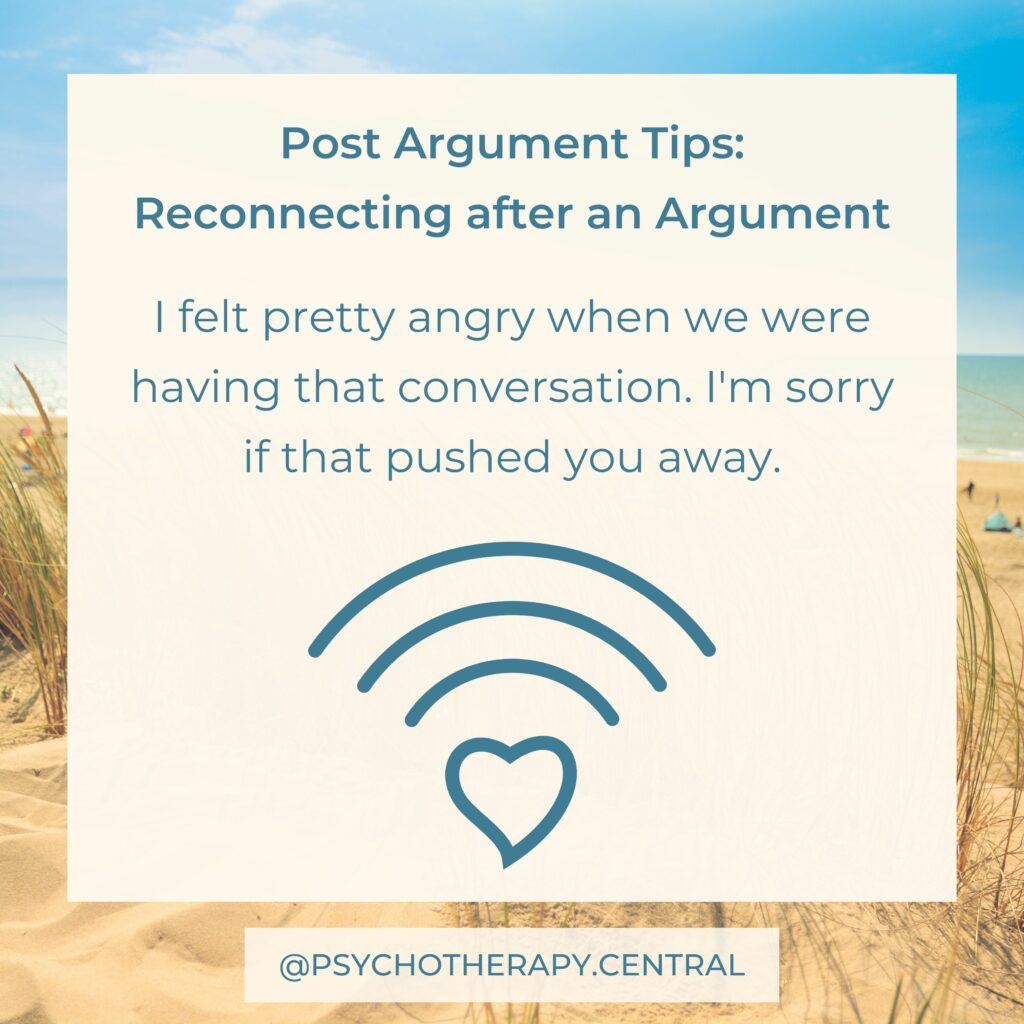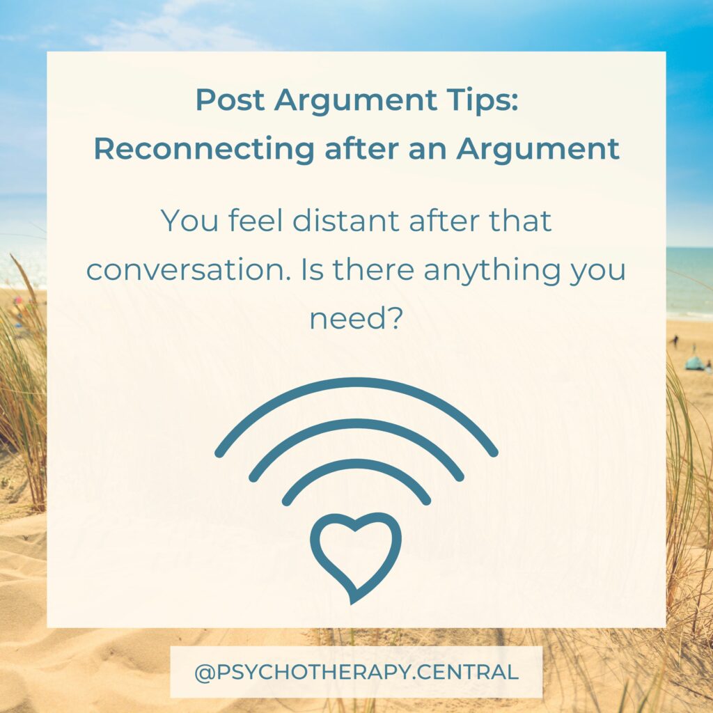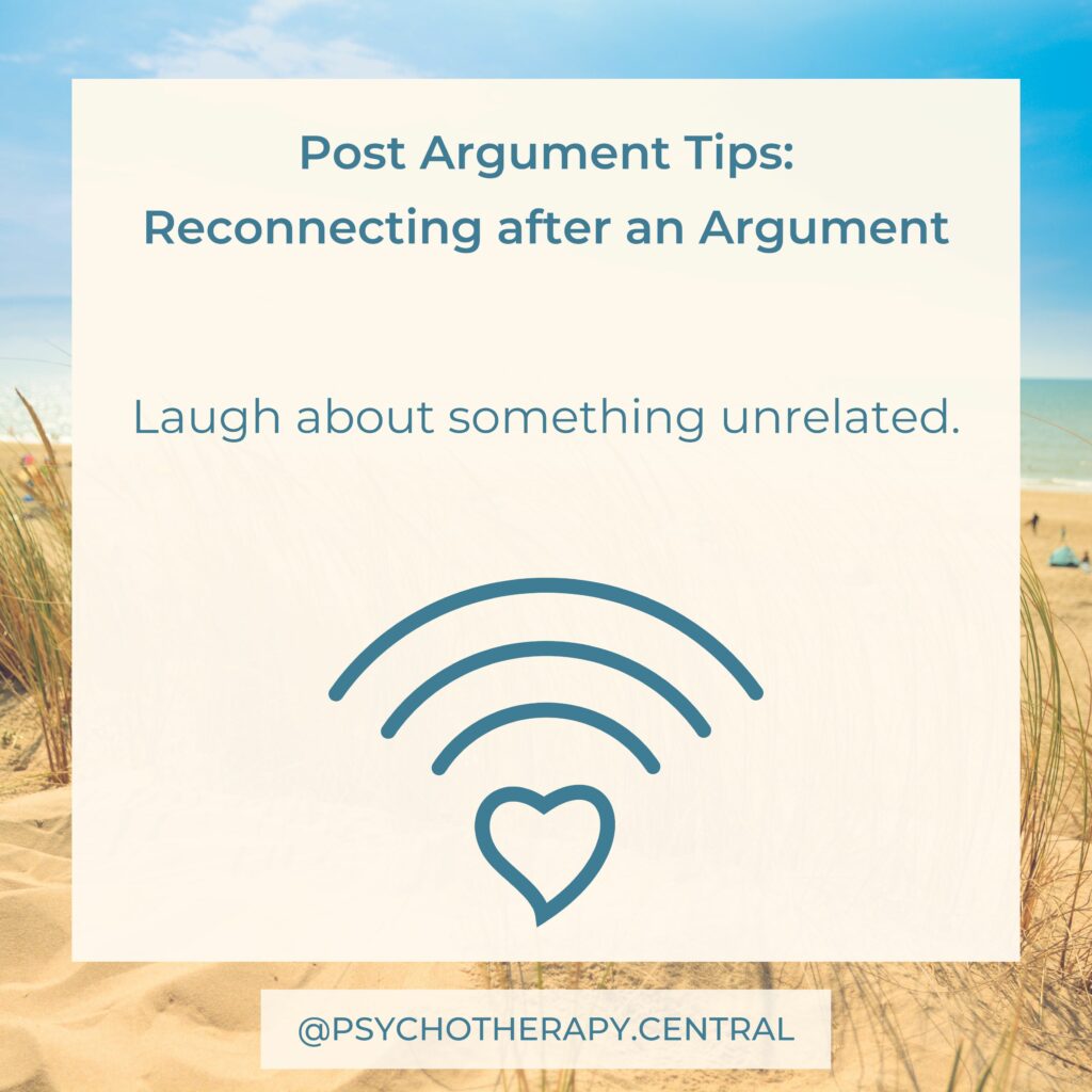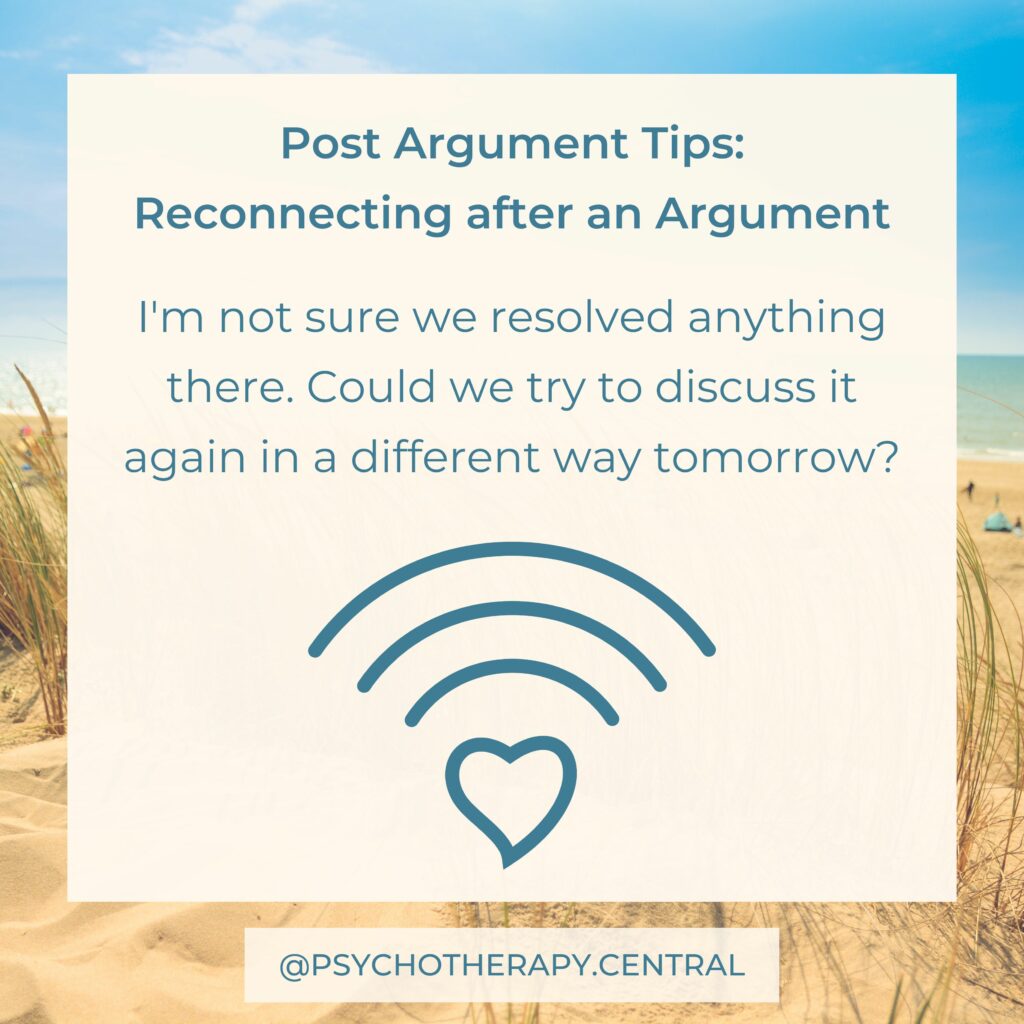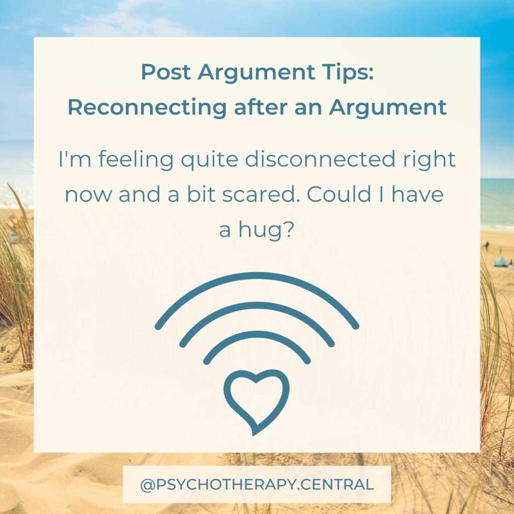 How couples repair after an argument has a significant impact on the quality of the relationship. You could read through these tips as a couple and discuss what each of you might like after a conflict.