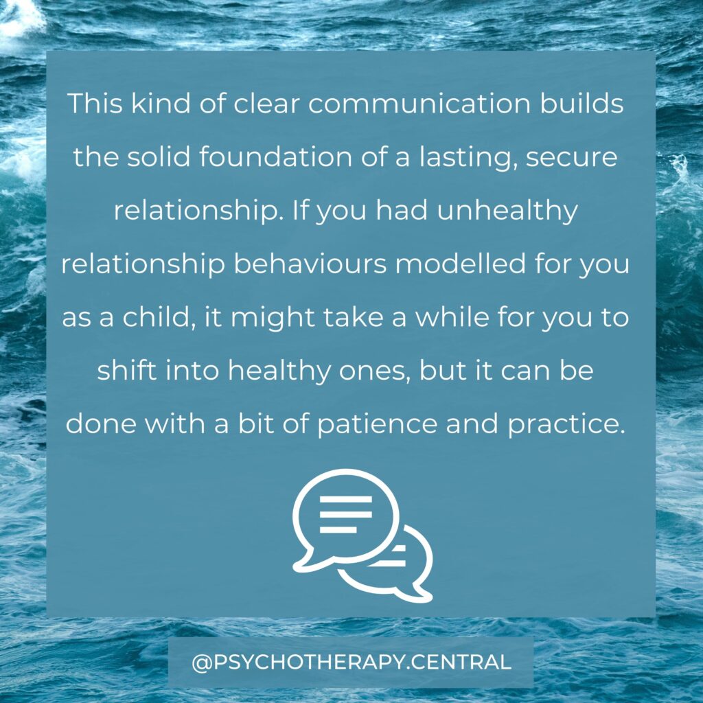 This kind of clear communication builds the solid foundation of a lasting, secure relationship. If you had unhealthy relationship behaviours modeled for you as a child, it might take a while for you to shift into healthy ones, but it can be done with a bit of patience and practice.