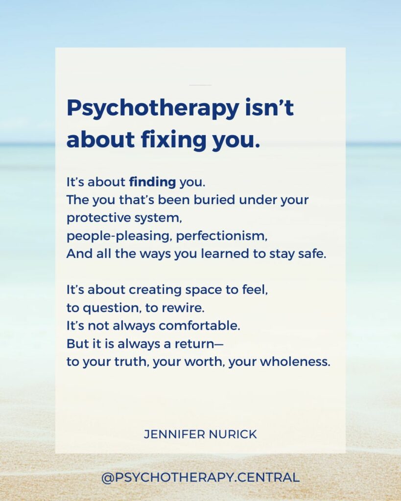Psychotherapy isn’t about fixing you. It’s about finding you. The you that’s been buried under your protective system, people-pleasing, perfectionism, And all the ways you learned to stay safe. It’s about creating space to feel, to question, to rewire. It’s not always comfortable. But it is always a return— to your truth, your worth, your wholeness.