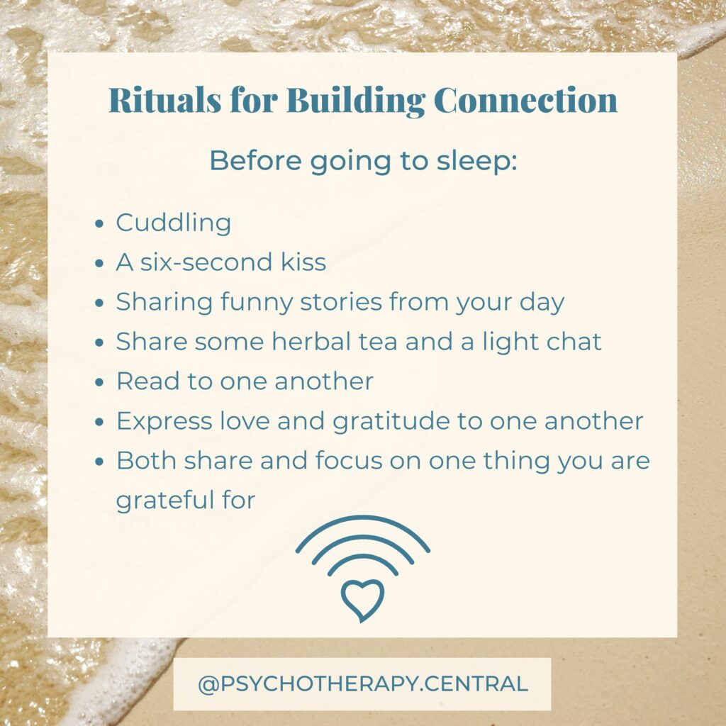 Choosing some meaningful rituals around sleep can help create a solid framework for connection in your relationship. When you think about rituals we have for our children to help set the scene for a good night’s sleep; brushing teeth, warm bath, special cuddly toy, reading a book, cuddles and kisses, time to talk openly about their day, it makes sense that this would be helpful as an adult.