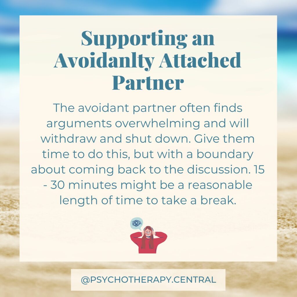 Be careful that this doesn’t become a fixed role, where the avoidant is all serious, and the other person just gets to play. The challenge for the avoidant is to access more of their playfulness and for the other person to be a grown-up when it is needed.