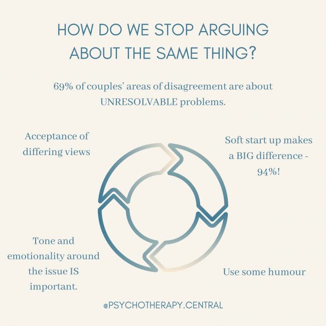Have you found yourself in relationship arguing about the same thing over and over with no outcome? If your answer is yes, you are not alone. Research has found that 69% of couples’ areas of disagreement are about UNRESOLVABLE problems. …