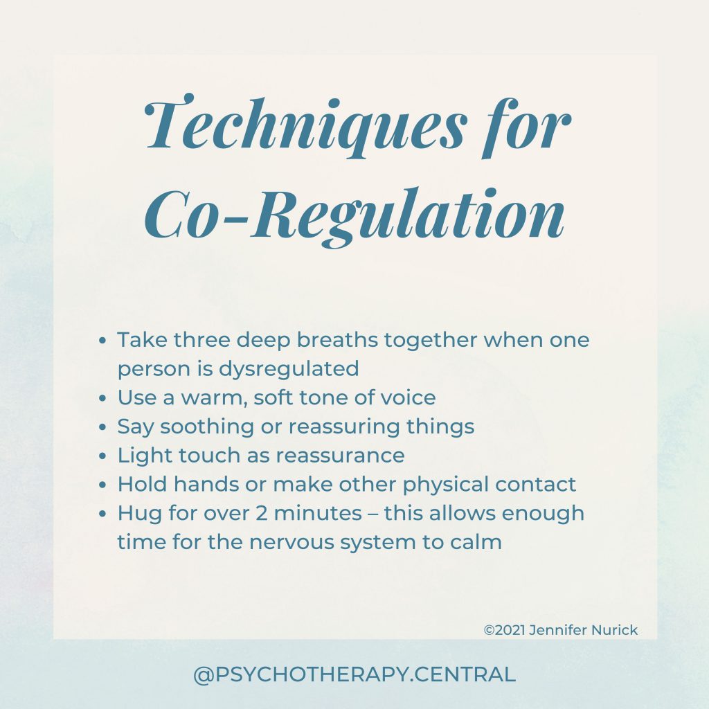 The good news is that self-regulation is something that can be learned through co-regulation as an adult. When you are in a relationship with someone you trust, you can begin practising co-regulation. It helps if this is something your partner understands and your practices in co-regulation are conscious.