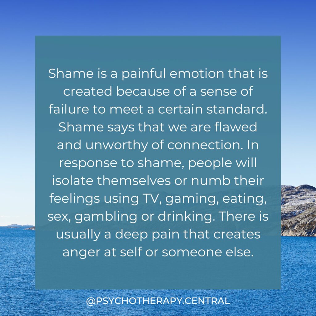Shame is a painful emotion that is created because of a sense of failure to meet a certain standard. Shame says that we are flawed and unworthy of connection. In response to shame, people will isolate themselves or numb their feelings using TV, gaming, eating, sex, gambling or drinking. There is usually a deep pain that creates anger at self or someone else.