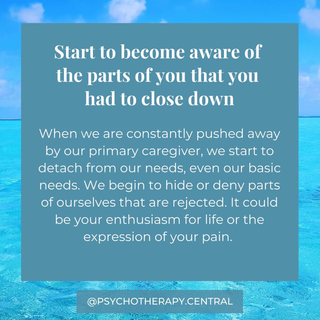 The first step in healing this wound is to get in touch with the part of self that was abandoned as a child. You can do this with a therapist or counsellor, who will help you begin to identify your feelings and needs, validate them and move into more relational intimacy. At home, you can start simply with tools like emotion charts to determine your feelings at different times and your needs to begin to feel safe having any emotions that might make you vulnerable.