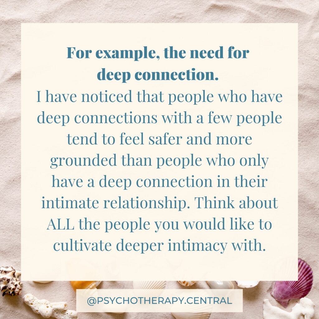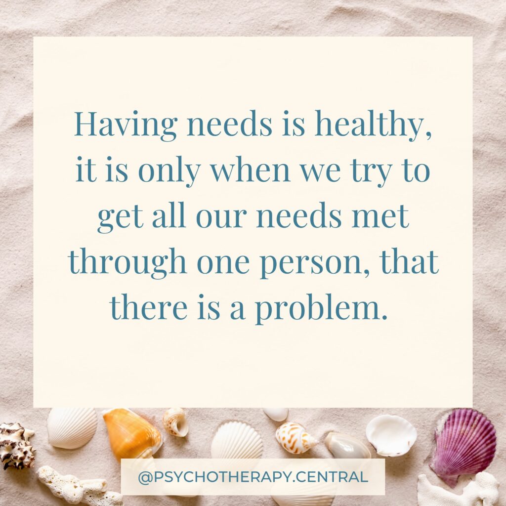 Attempting to get all our needs met through one person is often a subconscious pattern. We all have the need to be loved, and accepted, for play, for trust and connection. Some of these needs can only be met interpersonally, in relationships, but many of them can be met by self.
