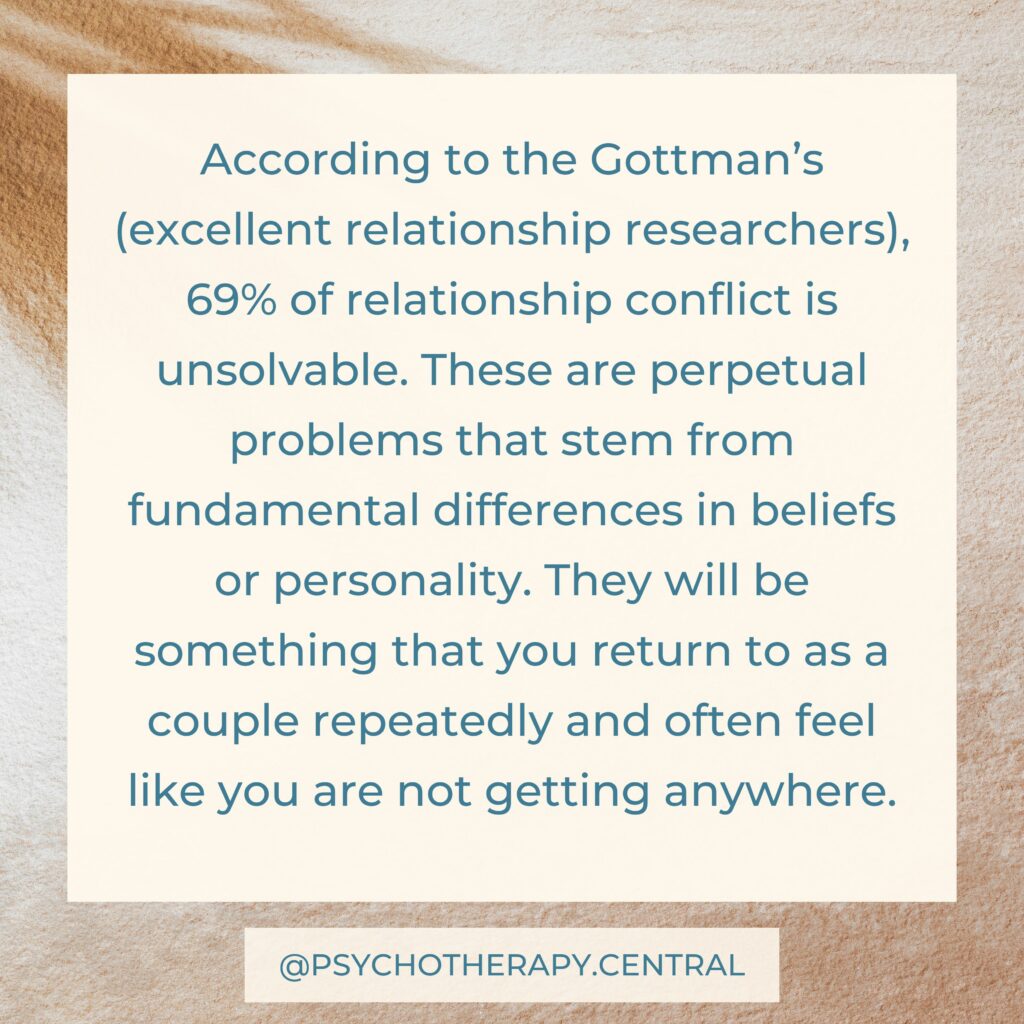 According to the Gottman’s (excellent relationship researchers), 69% of relationship conflict is unsolvable. These are perpetual problems that stem from fundamental differences in beliefs or personality. They will be something that you return to as a couple repeatedly and often feel like you are not getting anywhere.