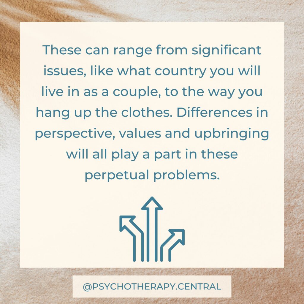 These can range from significant issues, like what country you will live in as a couple, to the way you hang up the clothes. Differences in perspective, values and upbringing will all play a part in these perpetual problems.