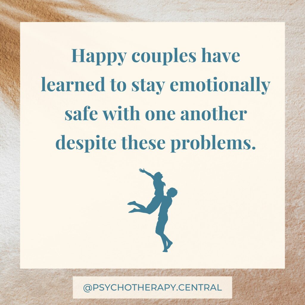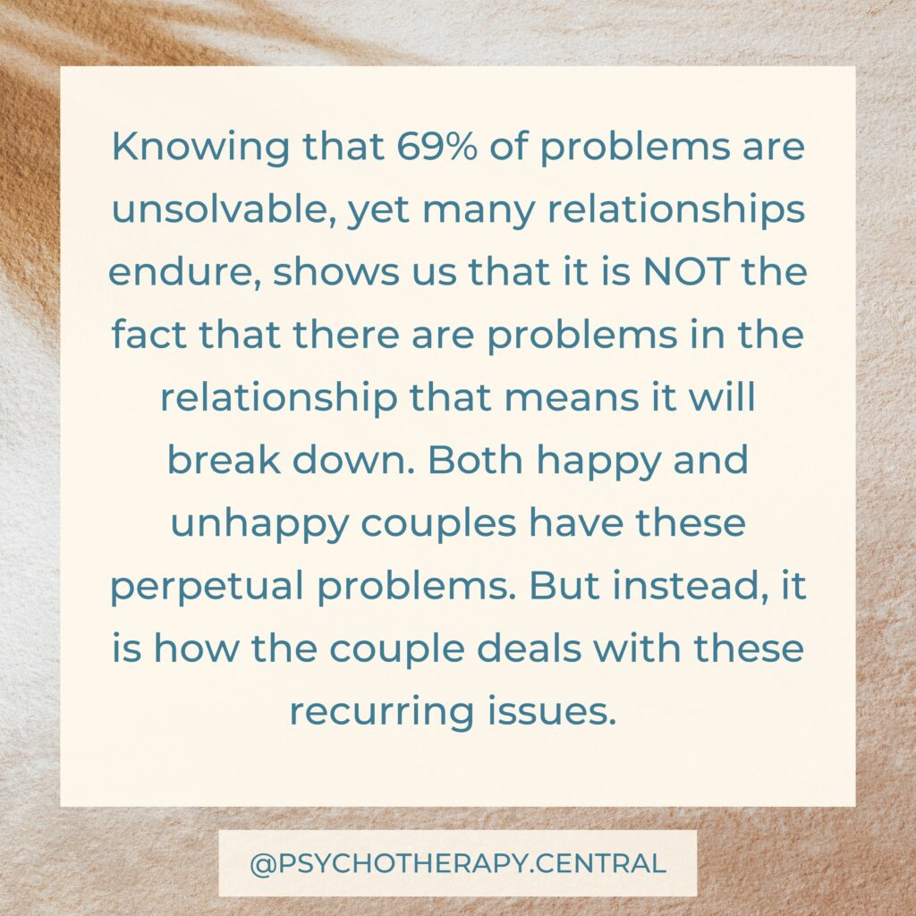 Knowing that 69% of problems are unsolvable, yet many relationships endure, shows us that it is NOT the fact that there are problems in the relationship that means it will break down. Both happy and unhappy couples have these perpetual problems. But instead, it is how the couple deals with these recurring issues. Happy couples have learned to stay emotionally safe with one another despite these problems.