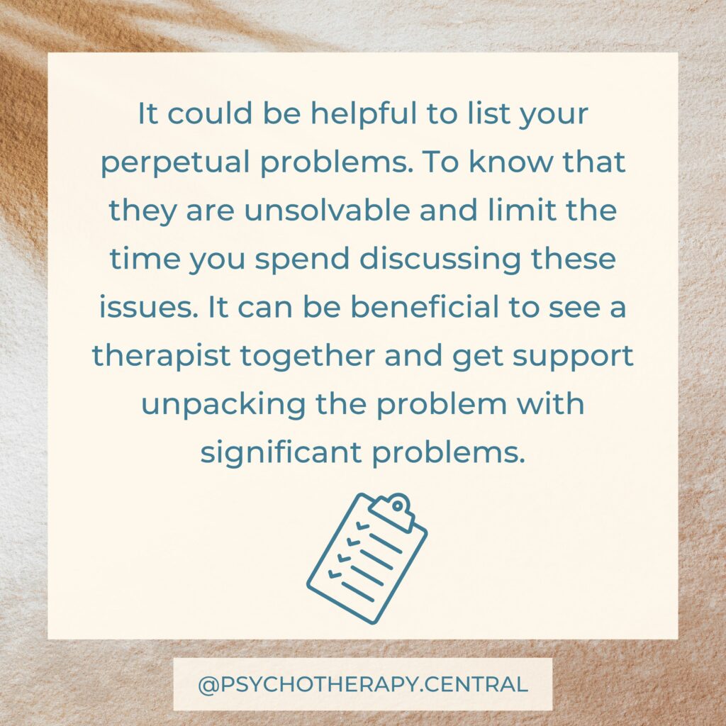 It could be helpful to list your perpetual problems. To know that they are unsolvable and limit the time you spend discussing these issues. It can be beneficial to see a therapist together and get support unpacking the problem with significant problems.