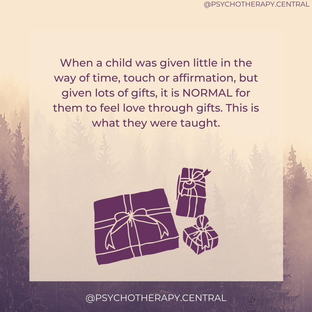 When a child was given little in the way of time, touch or affirmation, but given lots of gifts, it is NORMAL for them to feel love through gifts. This is what they were taught.