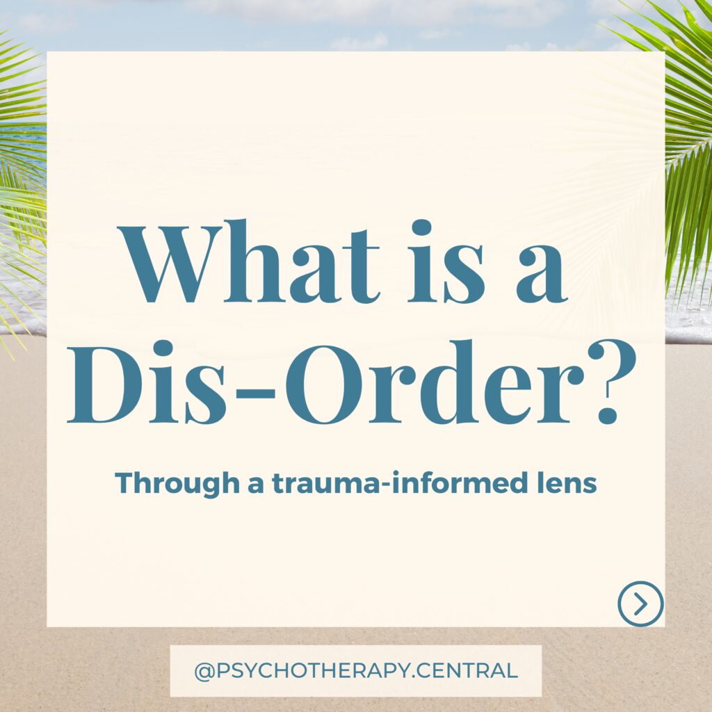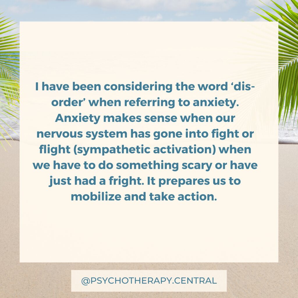 I have been considering the word ‘dis-order’ when referring to anxiety. Anxiety makes sense when our nervous system has gone into fight or flight (sympathetic activation) when we have to do something scary or have just had a fright. It prepares us to mobilize and take action.