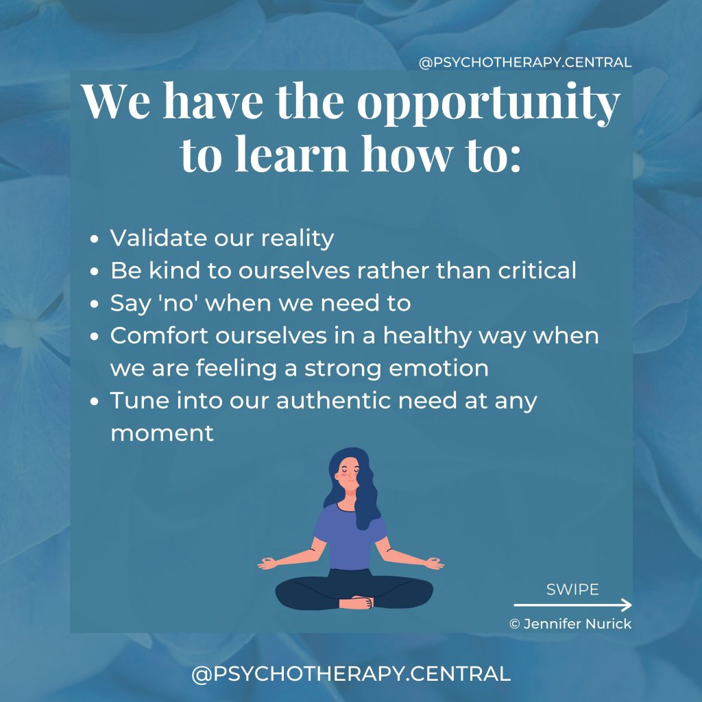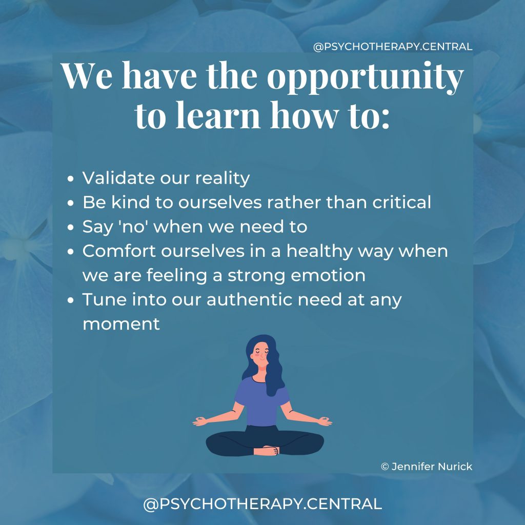 There is a considerable movement now in the area of reparenting, it is possible to learn to reparent yourself, to learn how to be present with the scared and lonely inner child who feels not good enough, rejected and hurt. As we reparent we learn to sit with her in painful moments, to acknowledge and validate the pain. We learn how to speak to ourselves in the form of the inner child, with the greatest love and compassion.