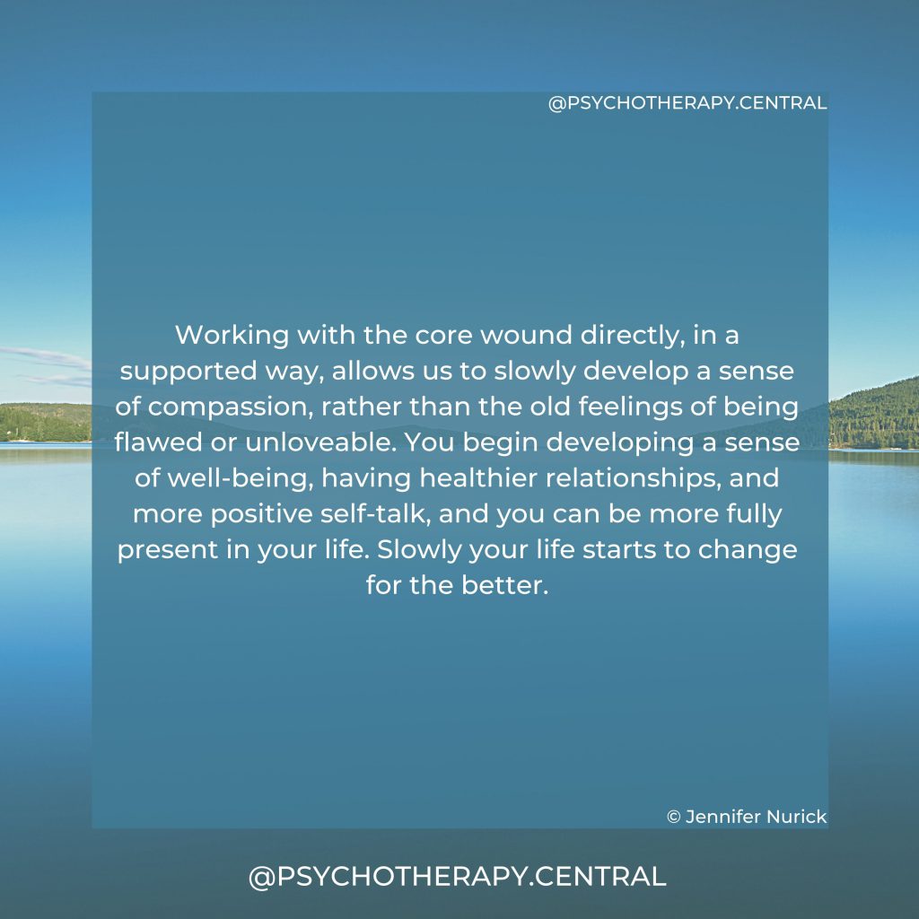 Working with the core wound directly, in a supported way, allows us to slowly develop a sense of compassion, rather than the old feelings of being flawed or unloveable. You begin developing a sense of well-being, having healthier relationships, and more positive self-talk, and you can be more fully present in your life. Slowly your life starts to change for the better.