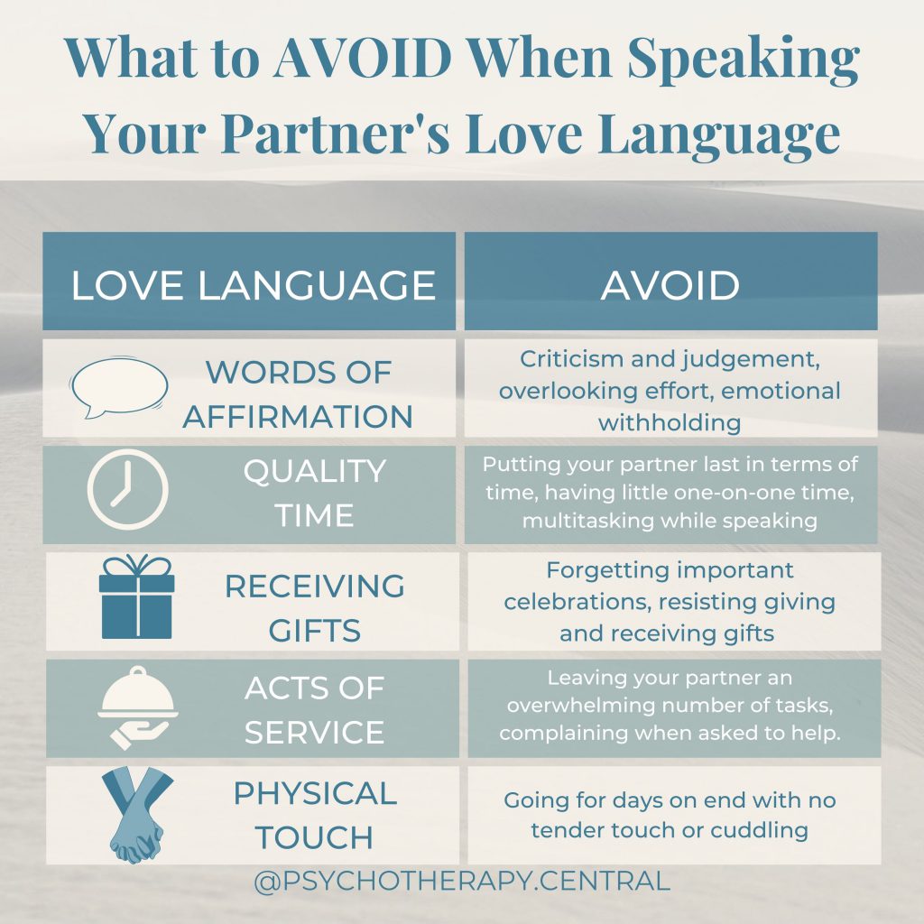 If they received little quality time as children, this will be even more triggering for your partner. It can re-awaken deep feelings of being unloved, and uncared for. This can cause a You might find that their reaction is bigger than you would expect, because an old wound has been re-opened. This is why it is important to AVOID certain behaviours linked to your partners love language. If you find your partner has been triggered, please know it is not all you, it is also their CHILDHOOD WOUND being triggered. Try to be gentle and loving as you both work out ways you can show them love in the language that resonates most deeply with them.