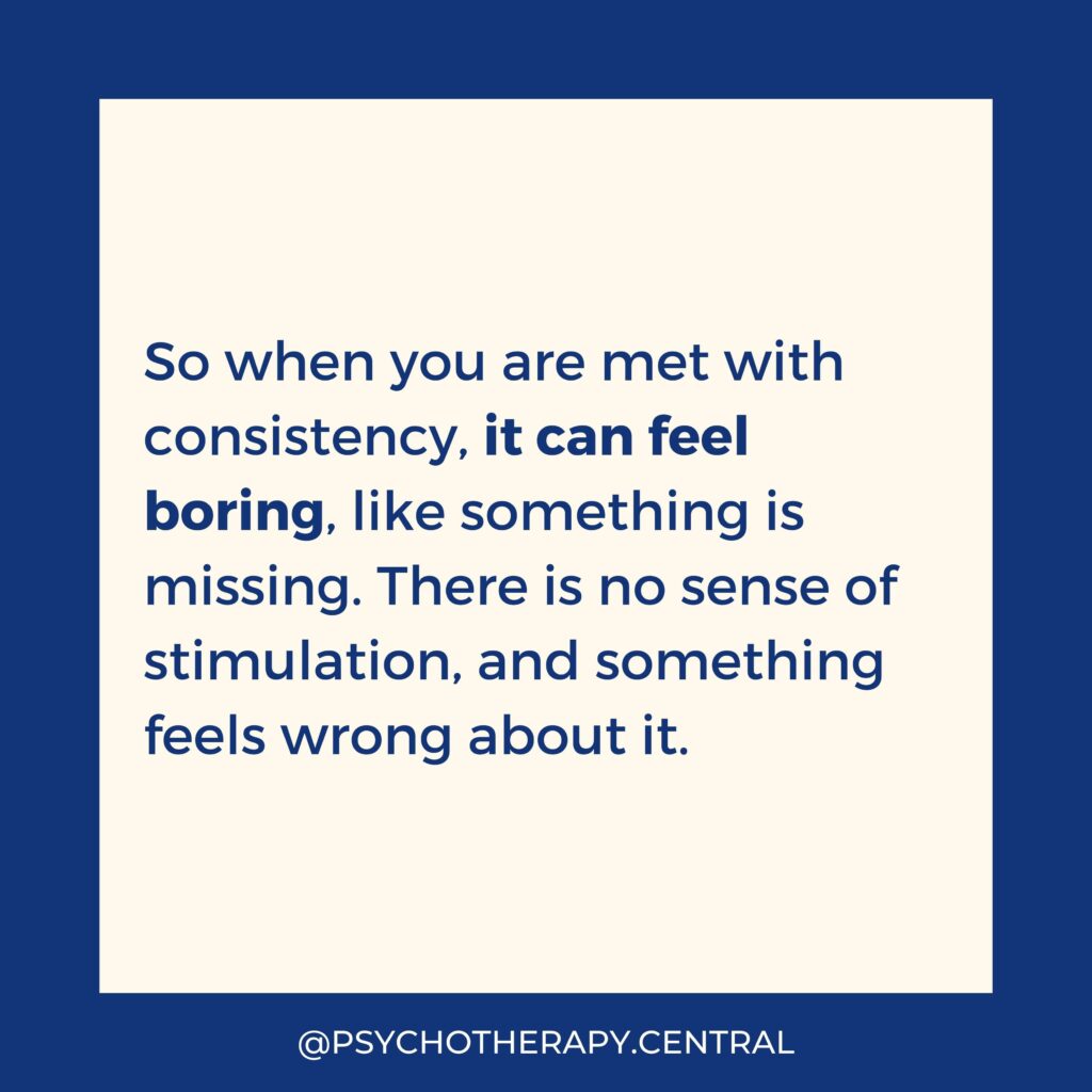 So when you are met with consistency, it can feel boring, like something is missing. There is no sense of stimulation, and something feels wrong about it.