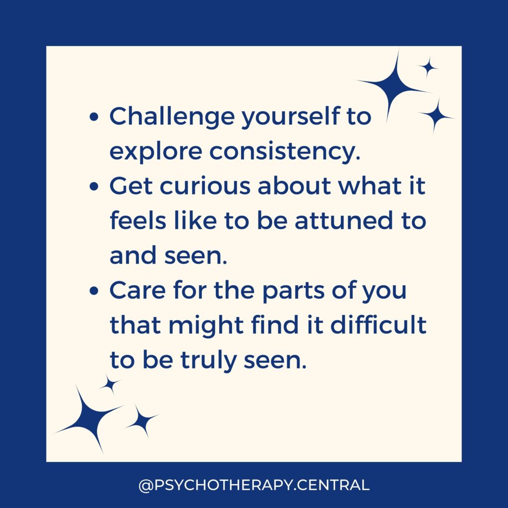 Challenge yourself to explore consistency. Get curious about what it feels like to be attuned to and seen. Care for the parts of you that might find it difficult to be truly seen.