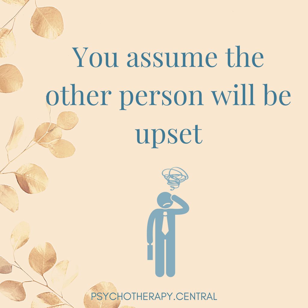 Let’s take ‘The other person will be upset’ first. A few years ago, I was in a situation where I was expected to do something for my family on a weekly basis. I didn’t mind doing this thing once or twice a month, but once a week was too much for me. I knew, if I shared my needs, they would be met with disapproval and there would likely be some conflict and discomfort. It was better for me to just keep doing it and ignore my needs.