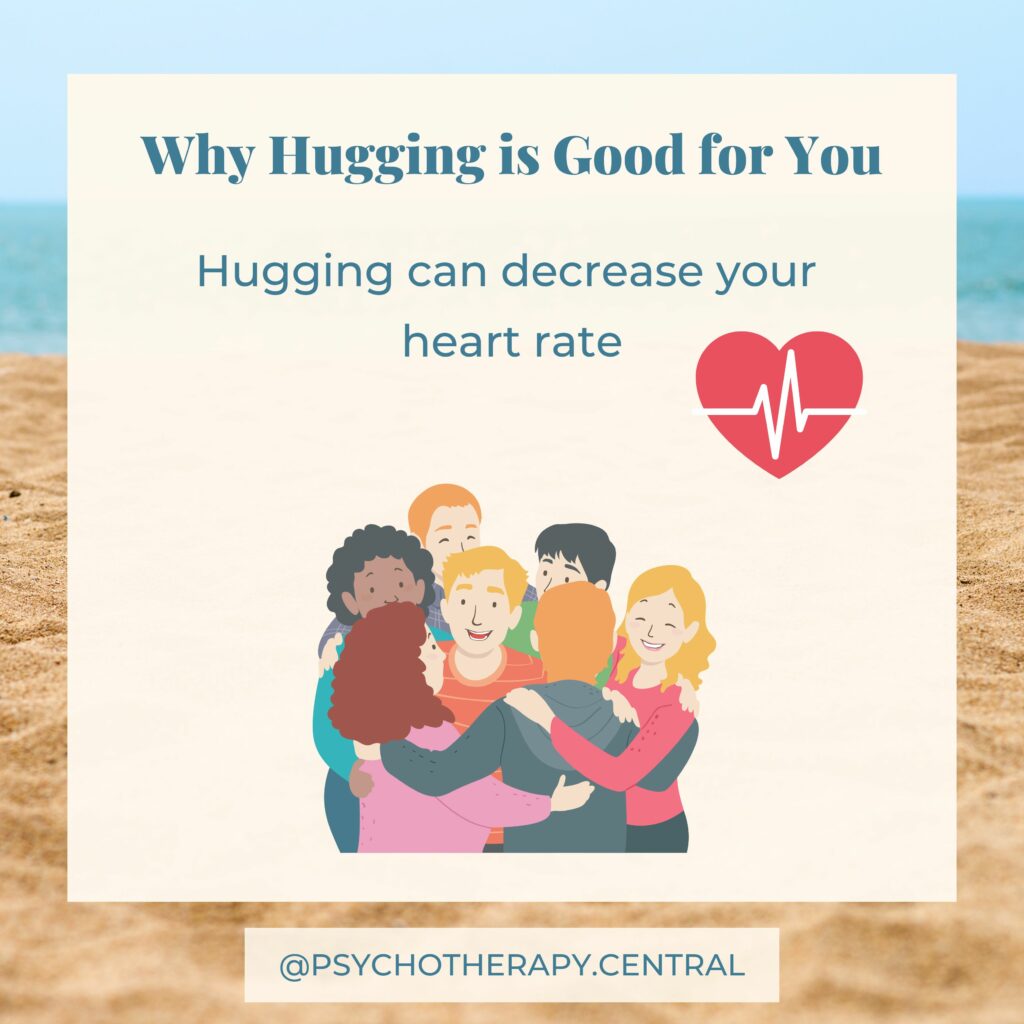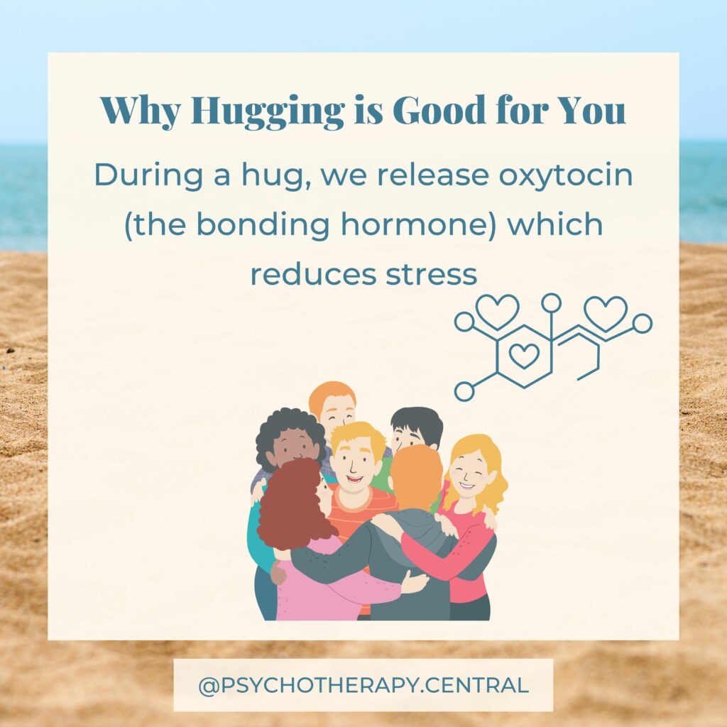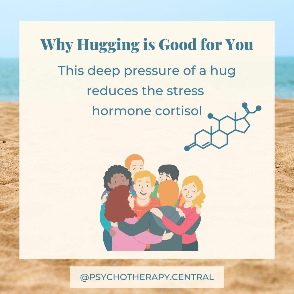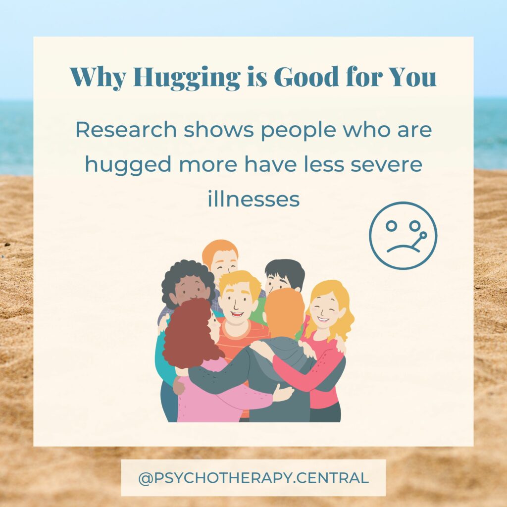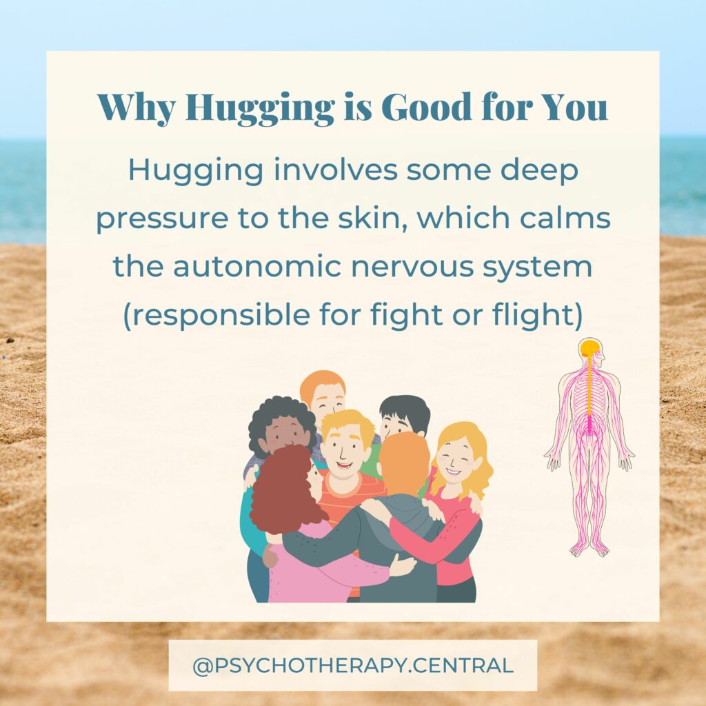 Next time you are in a hug, feel into your body and allow yourself to sense when you begin to feel calm and connected. Allow yourself to stay in the hug for as long as you need (assuming that is okay with the other person, of course). You could even time it and see how long it was.